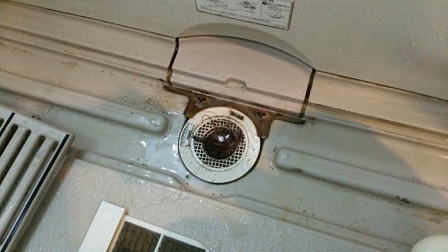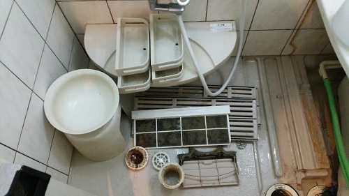 排水溝の周り、エプロンカバー内は汚れによるヌメりがひどい状態でした。