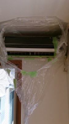 本体カバーを外し、養生してエアコン内部を洗い上げる作業になります。